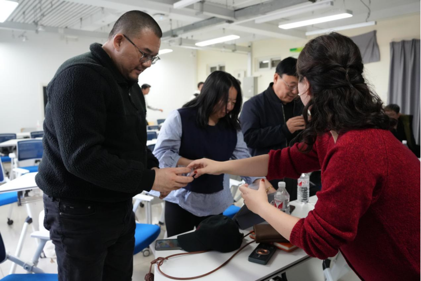 评委团队由公司领导、专业教师和行业专家组成,他们认真听取了每个小组的汇报,分头参观并体验了各组同学的装置作品,对各个小组的作品进行了点评,提供了宝贵的建议。此次评分不同于以往的评图流程,每个评委们手中都持有一定数量可点亮的“小灯泡”,他们根据每个小组作品的互动体验将灯泡放在心仪的作品上点亮。这种新颖的评分方式不仅增加了活动的趣味性,也激发了同学们的参与热情。