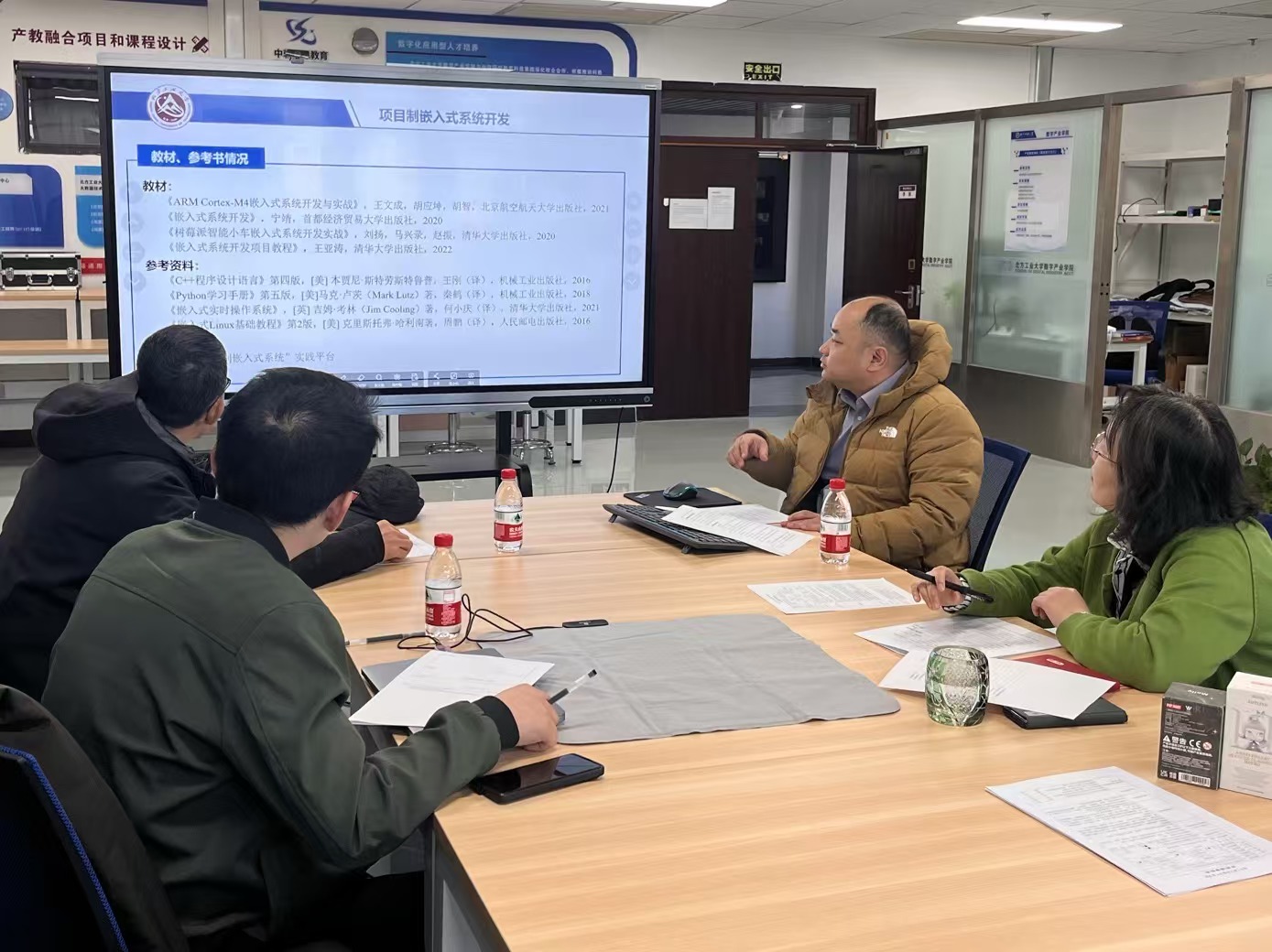1月9日下午,【智能控制-智能机器人】产业教育项目团队率先对《项目制嵌入式系统开发》课程展开了审核。校外企业专家矩侨工业总监谷震源和校内嵌入式系统课程资深教授赵仁涛老师担任审核专家,从课程的任务设计、硬件保障和教学资源各方面对课程准备情况做了审核,并就课程的创新思维训练实施办法做了深入的讨论。