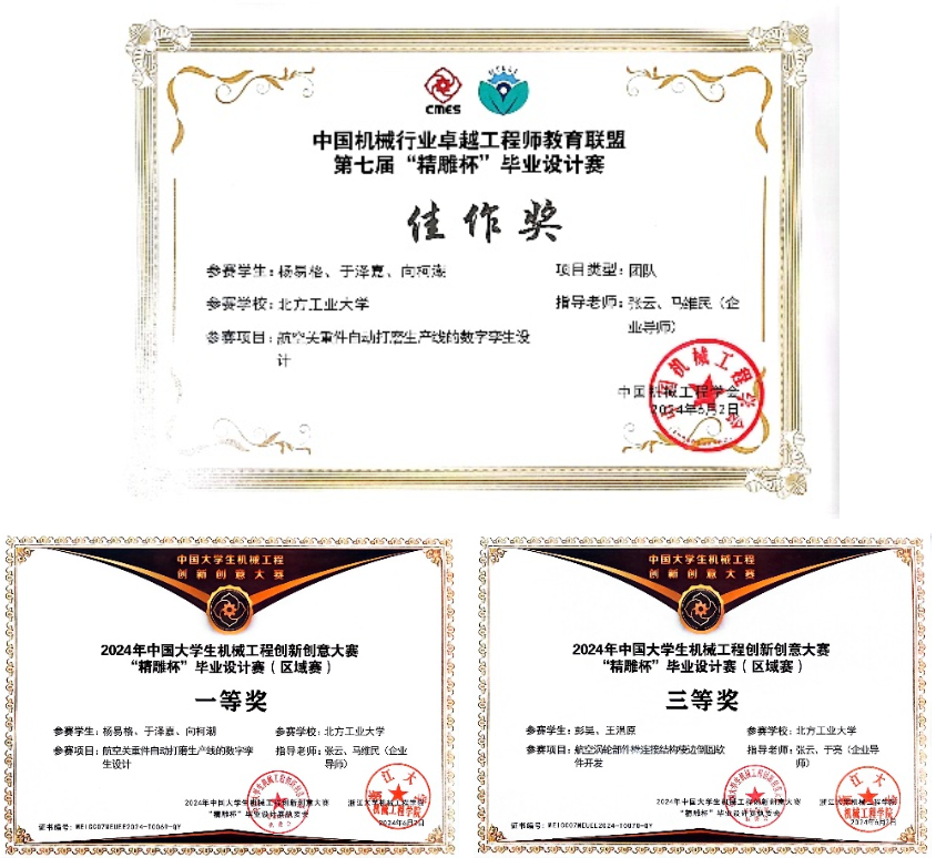 bv伟德智能制造项目共3项团体作品成功参赛,在北部赛区区域赛阶段荣获北部赛区区域赛一等奖1项、三等奖1项;在全国赛阶段,企业导师马维民和校内导师张云指导员工杨易格、于泽嘉、向柯潮所做毕业设计作品荣获全国赛优秀佳作奖。