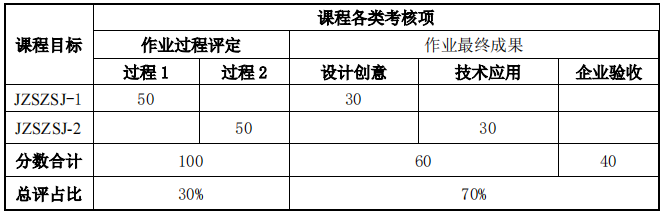本课程考核采用设计大作业综合考核,作业过程成绩占30%、作业最终成果成绩占70%。设计大作业以组为单位完成,教师跟踪员工进度并提供指导。员工需要完成规定的作业和任务,结课成绩根据以下考核方案计算得到。